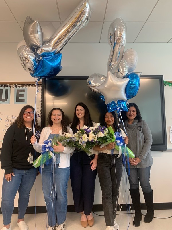 The two seniors were surprised when the drumline, the school counseling department, and Principal Dana Paredes visited them in their English class to announce the news.