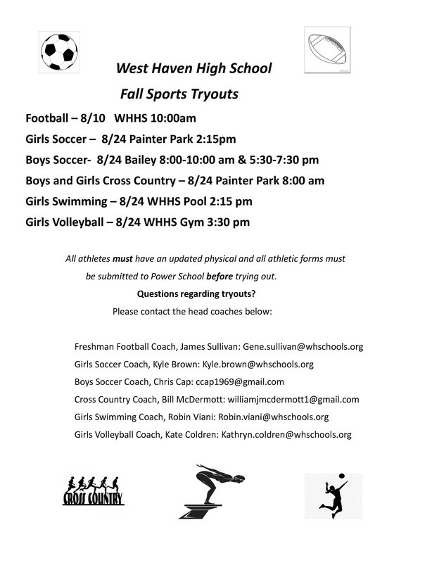 The Athletic Department at West Haven High School wants to remind students/athletes planning to play a Fall sport, that they need to have a sports physical to try out for any sport at WHHS. Physical forms can be uploaded to PowerSchool, or a hard copy can be handed to the nurse at WHHS.